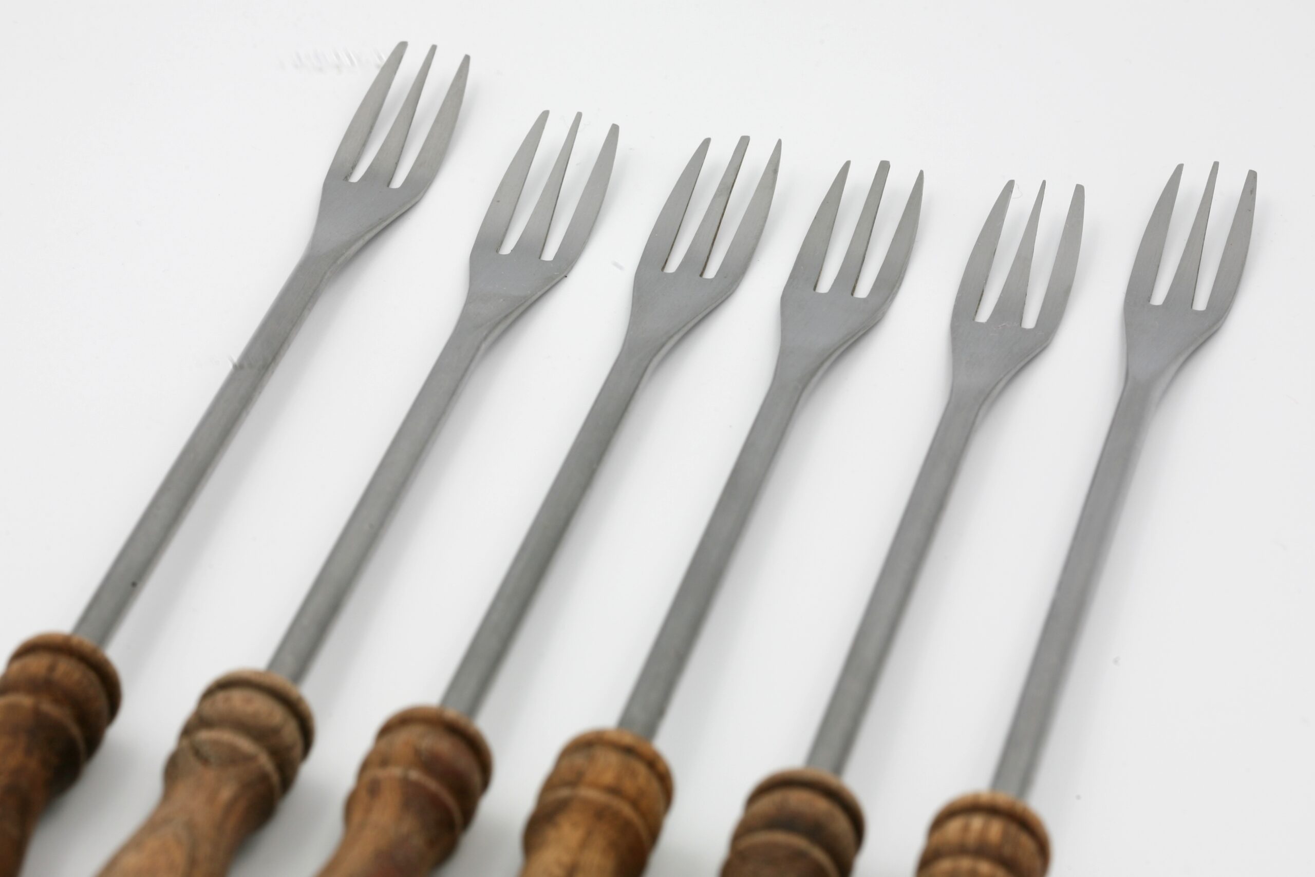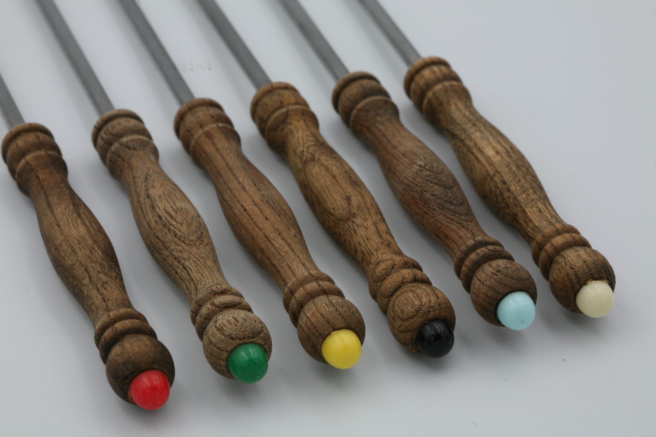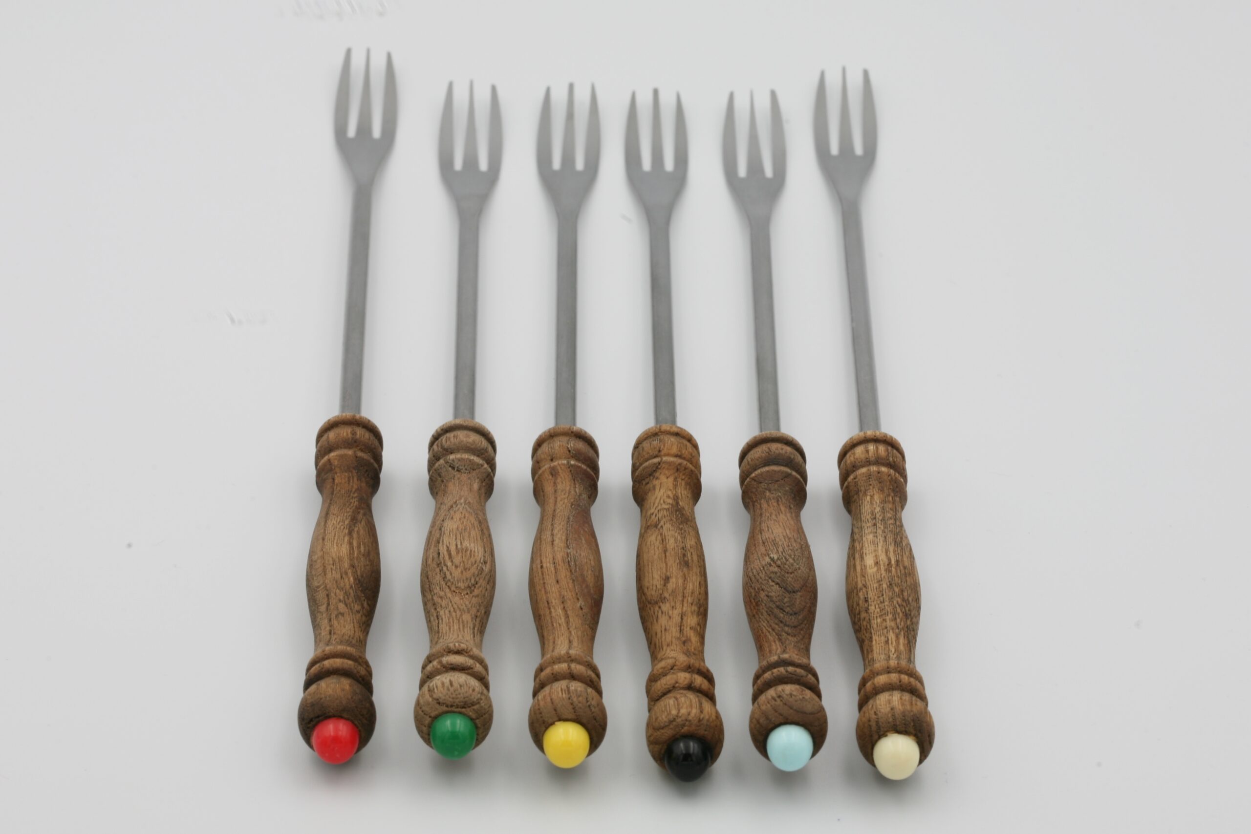 They are made of stainless steel and wood with different colored plastic tips, featuring a classic design found in many Swiss households.