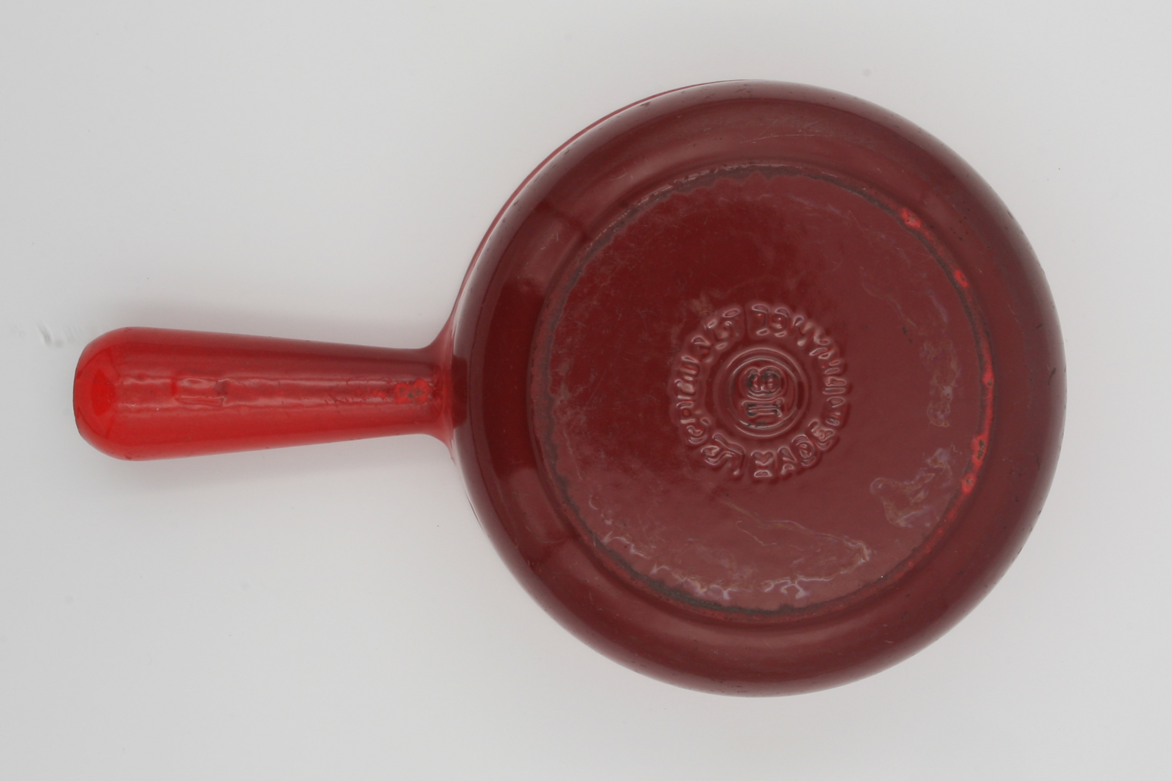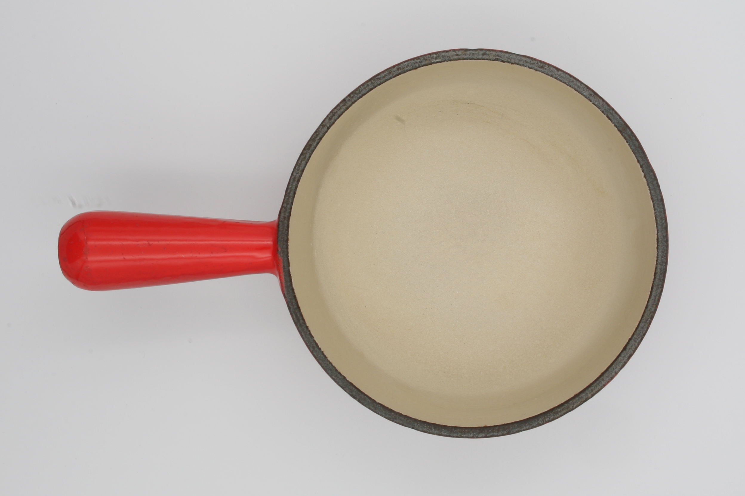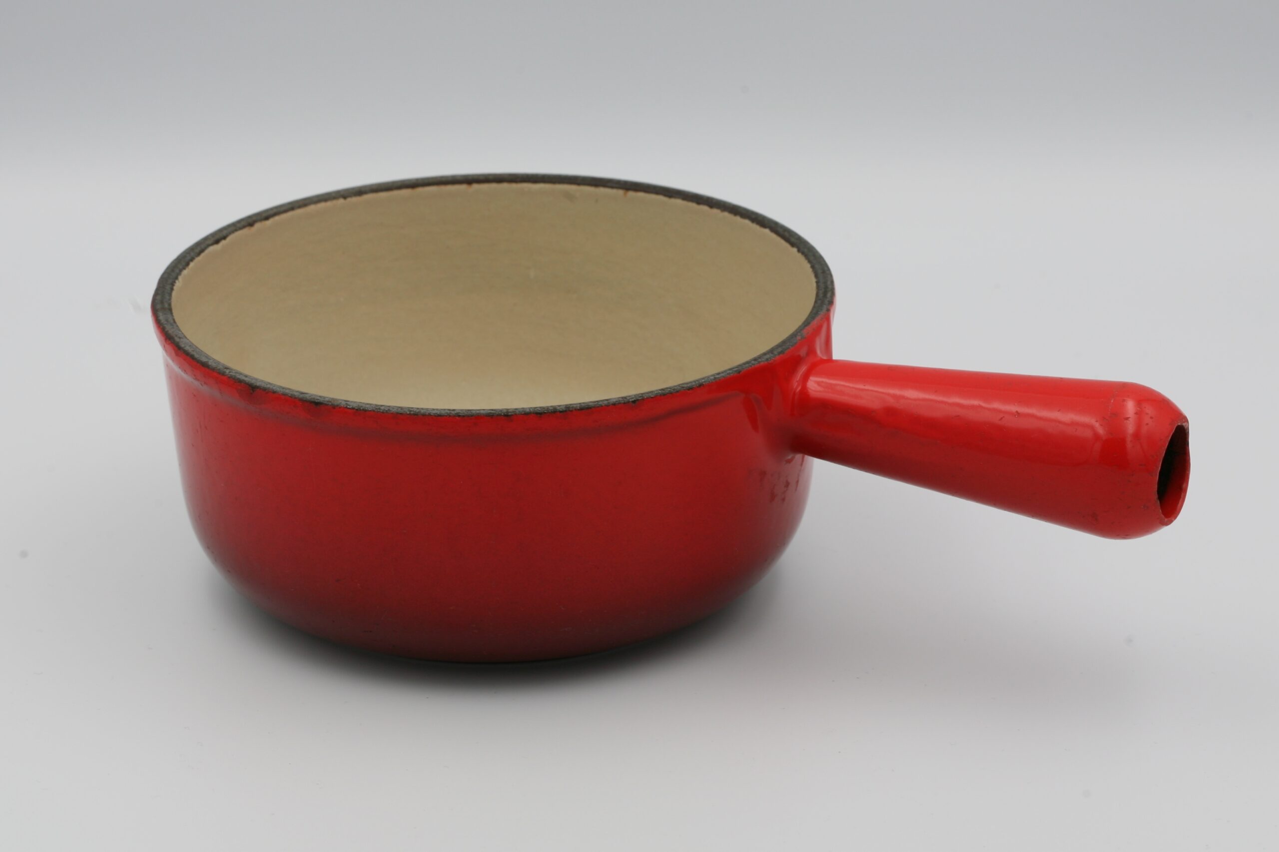 Il est rouge-orangé à l’extérieur et blanc cassé à l’intérieur, il est en fonte (compatible avec l’induction), mesure 16 cm de diamètre et peut contenir env. 1 litre.