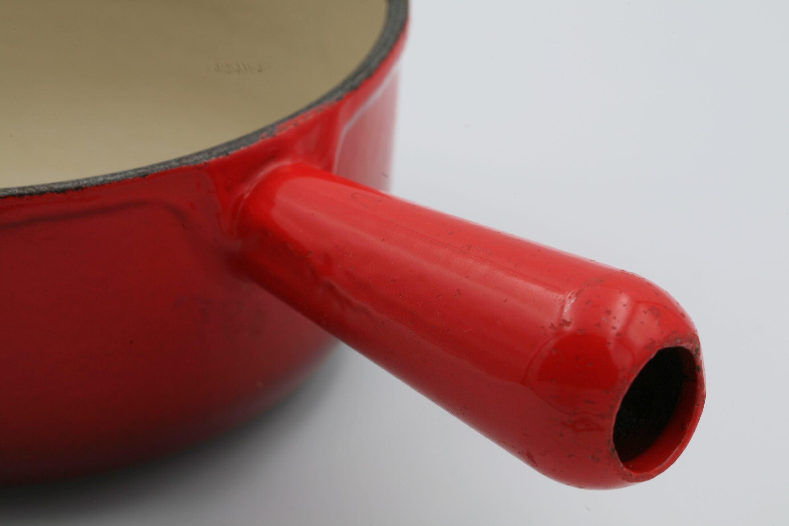 Ce caquelon, marqué par son usage dans un restaurant à fondue, conserve toute sa qualité et son charme d’ustensile traditionnel.