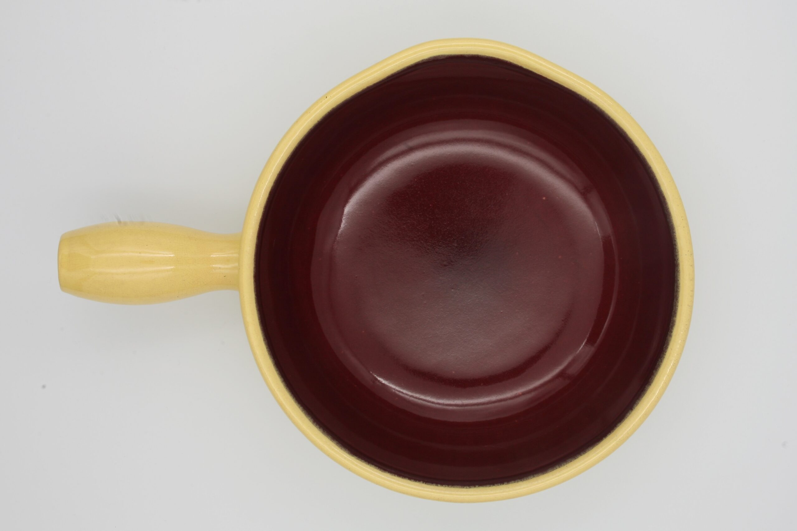 Il est jaune à l’extérieur et bordeaux à l’intérieur, il est en céramique (pas compatible avec l’induction), mesure 24 cm de diamètre et peut contenir env. 3,2 litres.