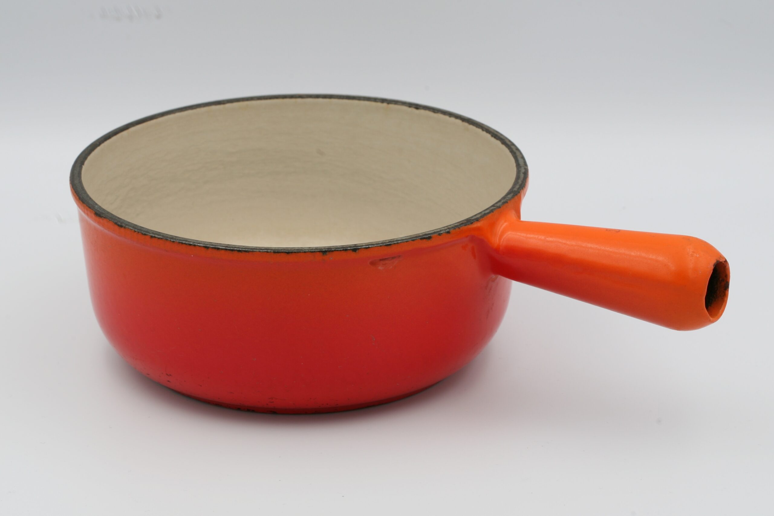 Ce caquelon, marqué par son usage dans un restaurant à fondue, conserve toute sa qualité et son charme d’ustensile traditionnel.
