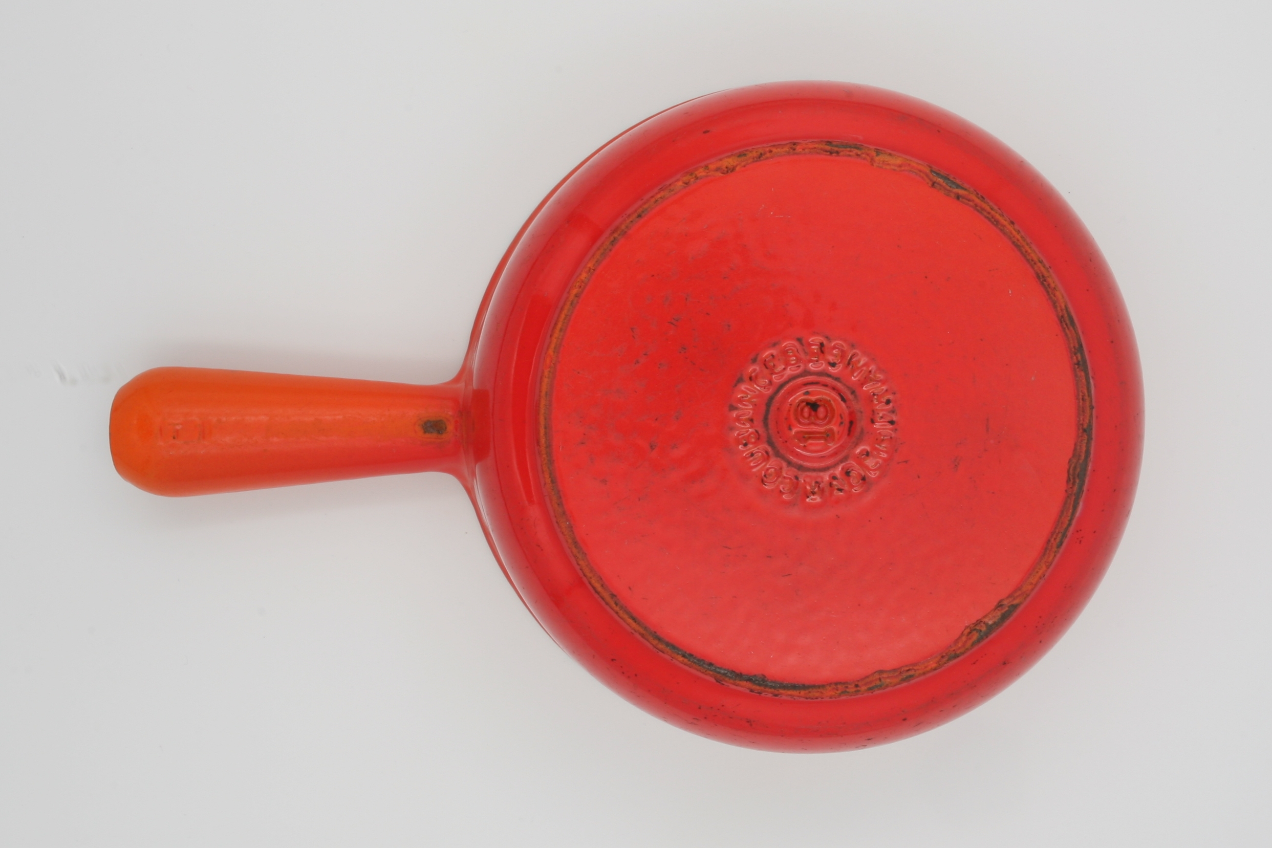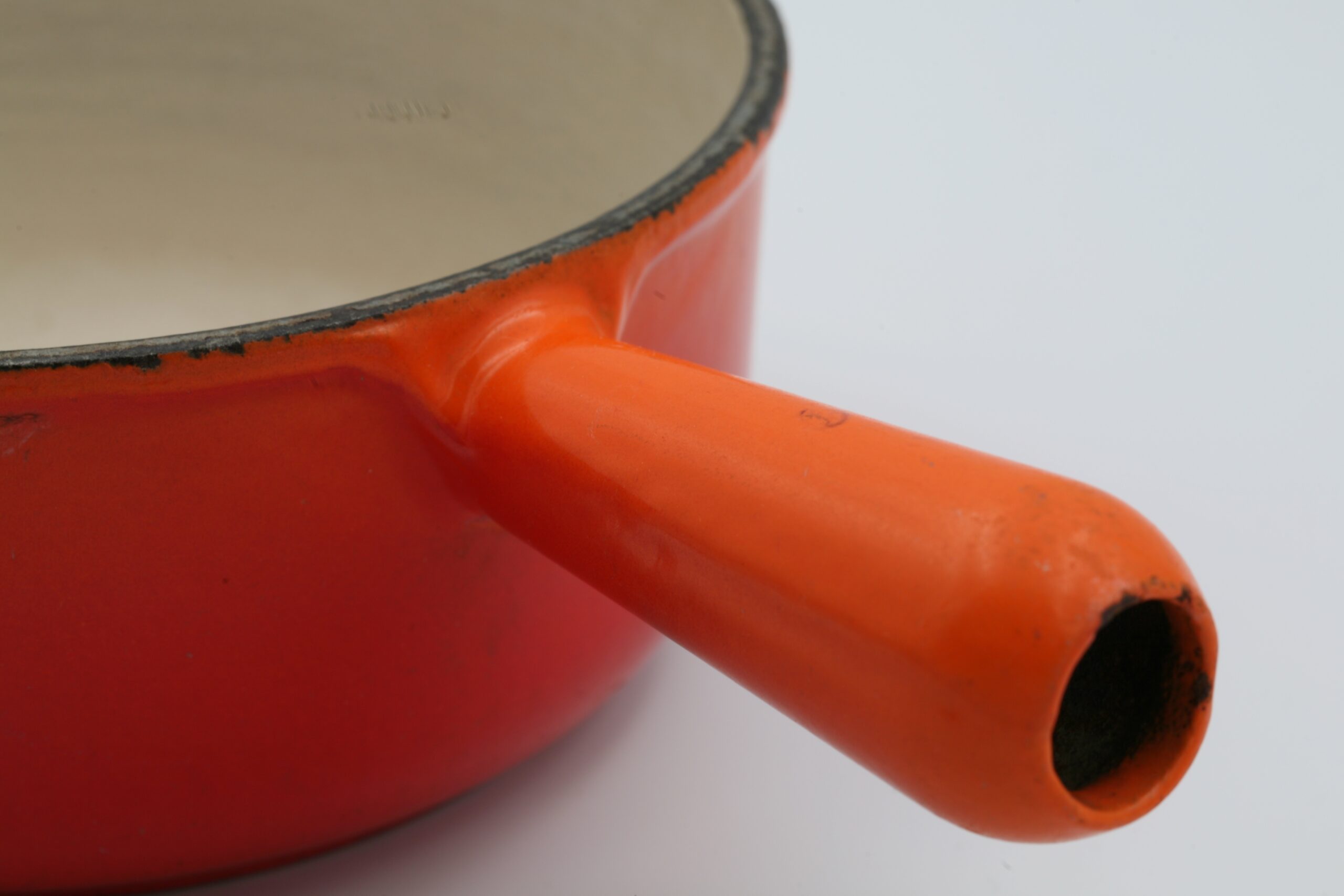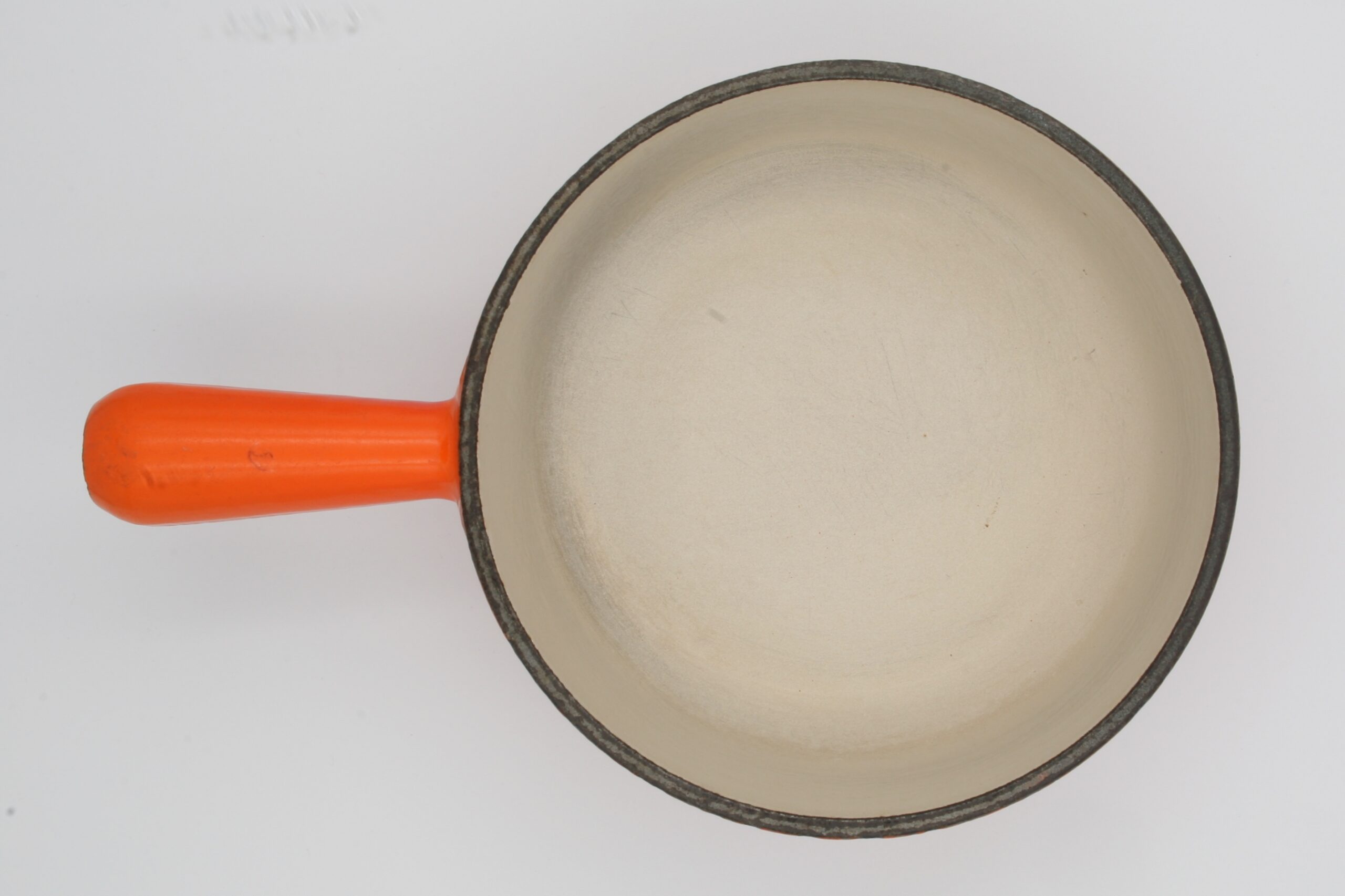 Il est orange à l’extérieur et blanc cassé à l’intérieur, il est en fonte (compatible avec l’induction), mesure 18 cm de diamètre et peut contenir env. 1.4 litre.