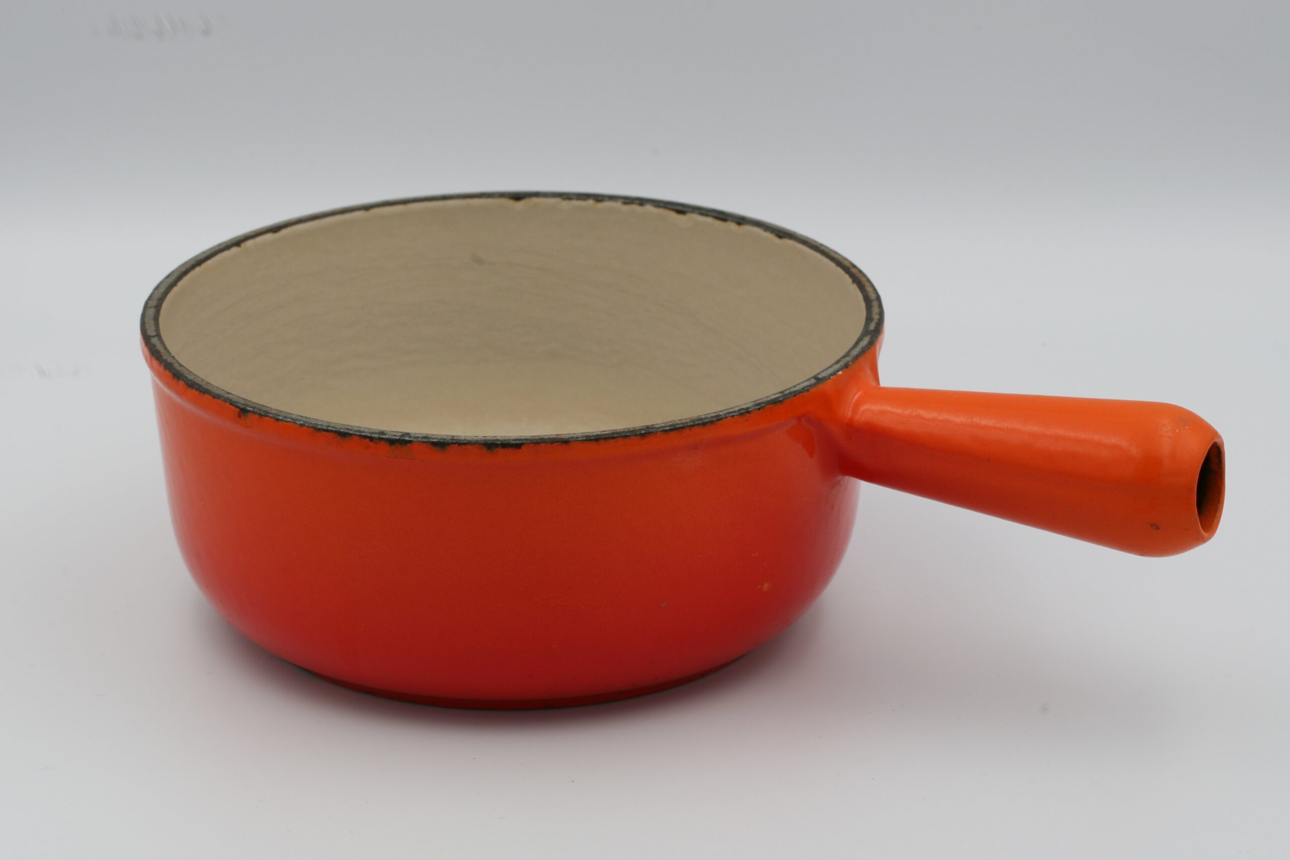 Ce caquelon, marqué par son usage dans un restaurant à fondue, conserve toute sa qualité et son charme d’ustensile traditionnel.