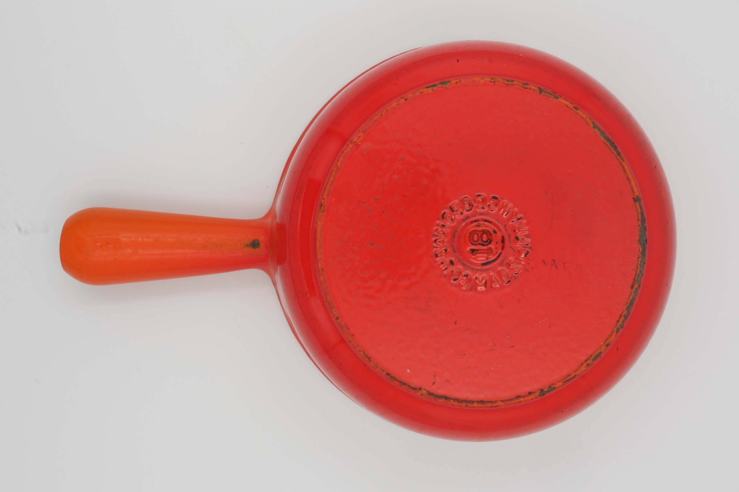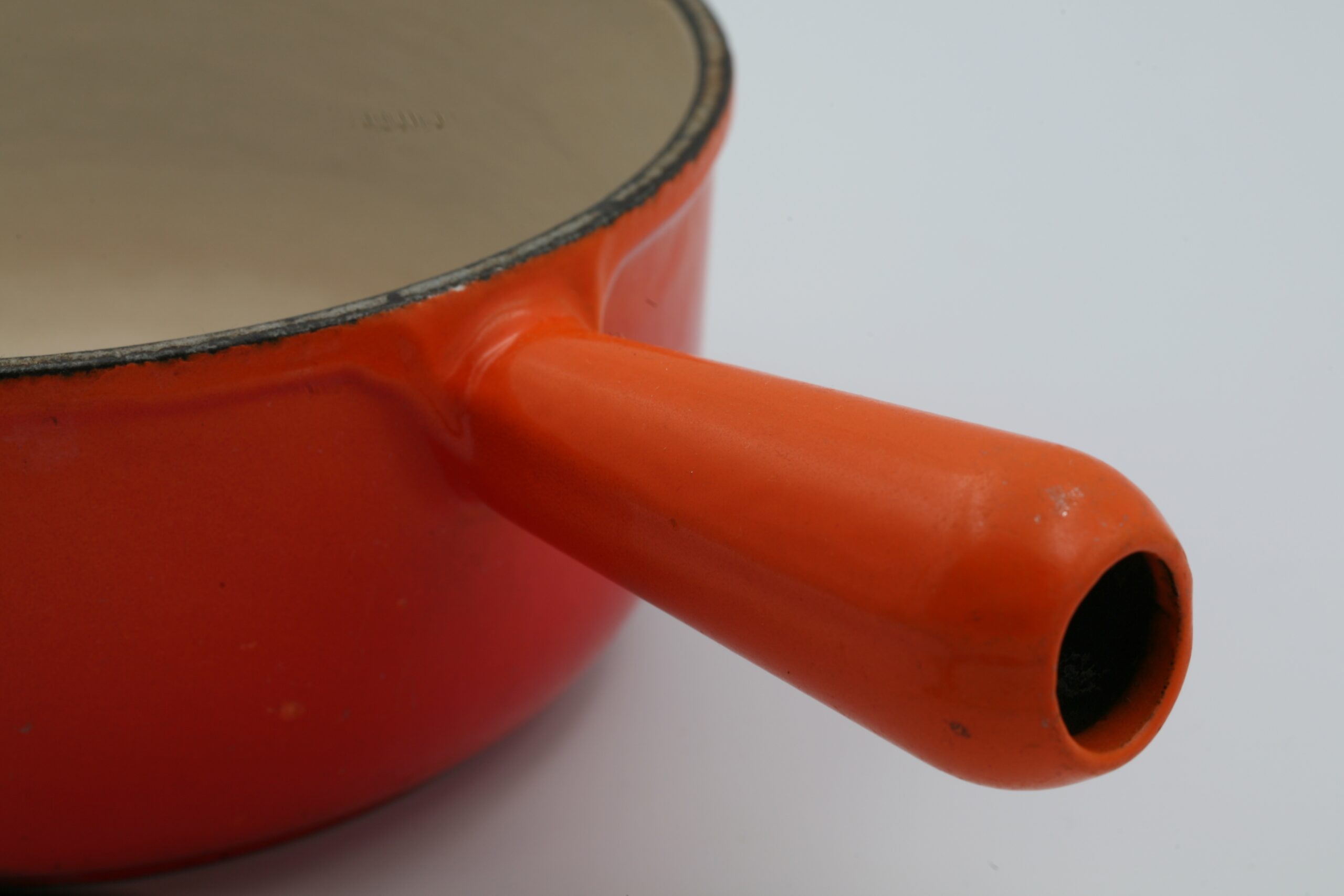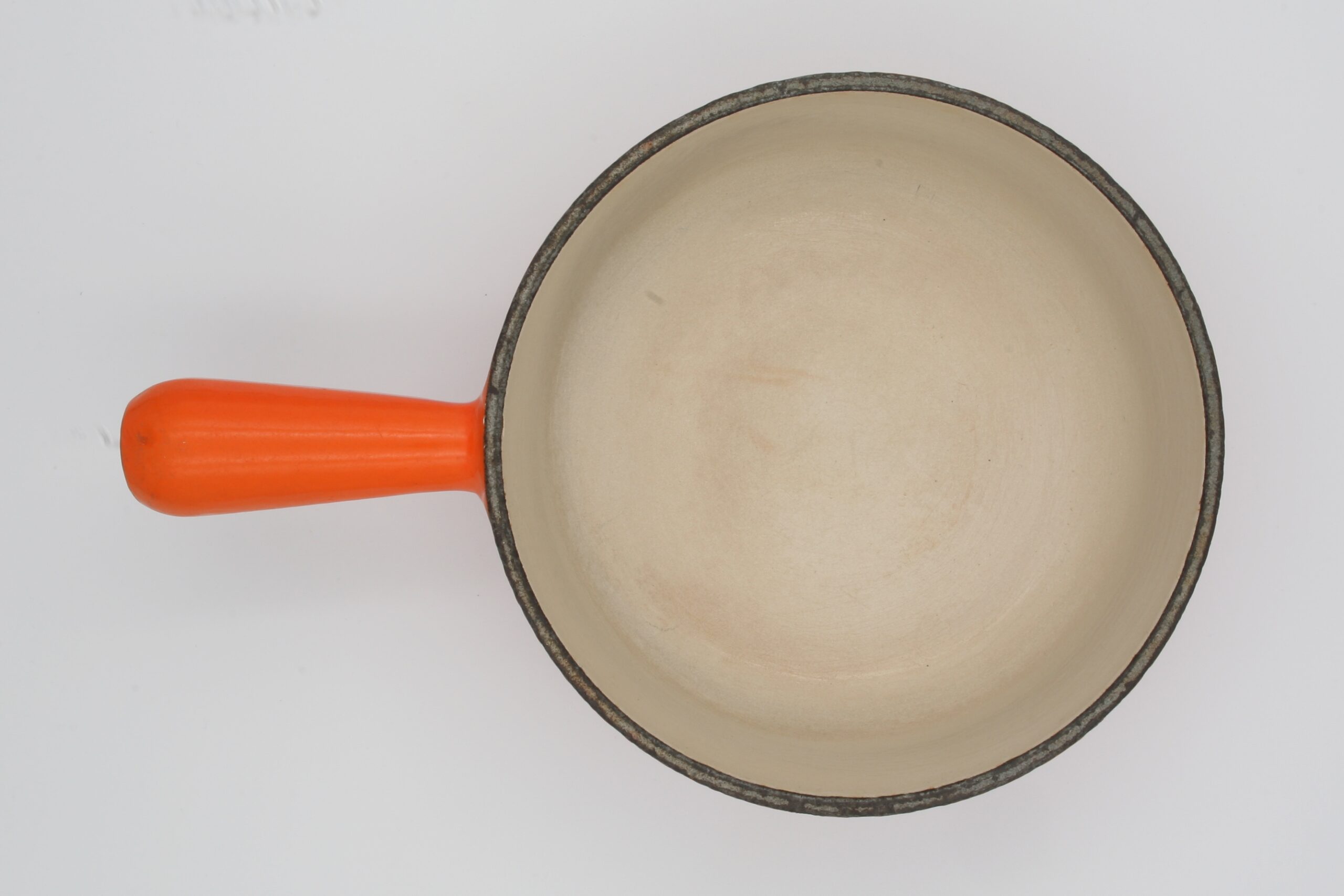 Il est orange à l’extérieur et blanc cassé à l’intérieur, il est en fonte (compatible avec l’induction), mesure 18 cm de diamètre et peut contenir env. 1.4 litre.