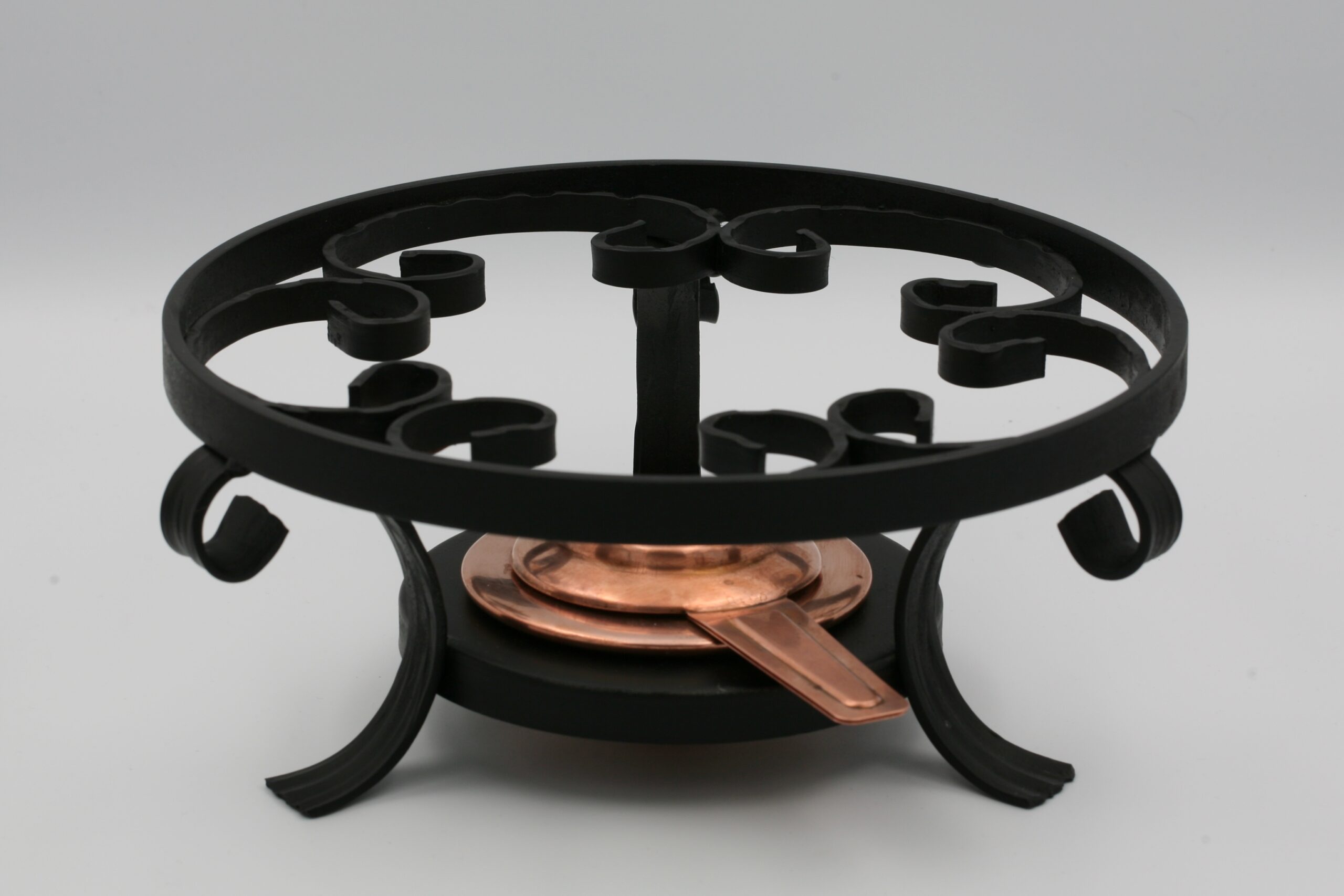 Il est en fer forgé, il a été repeint avec une peinture spéciale haute température, le brûleur est en cuivre et à alcool à brûler.